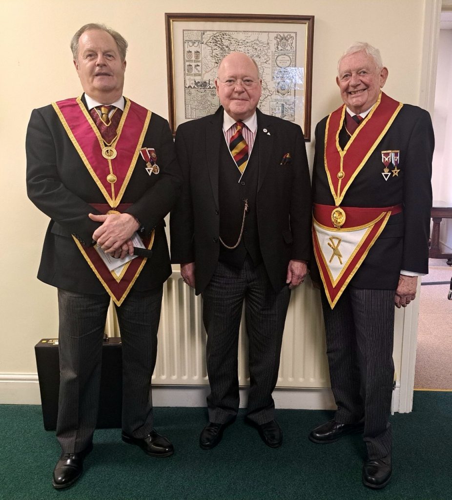 Accompanying the District Grand Master were Ill Comp Peter Stokes, Deputy District Grand Master and Ill Comp Chris Denley, Principal District Grand Principal Conductor of the Work, and Ill Comp Paul Fernandez-Montes, District Grand Recorder.